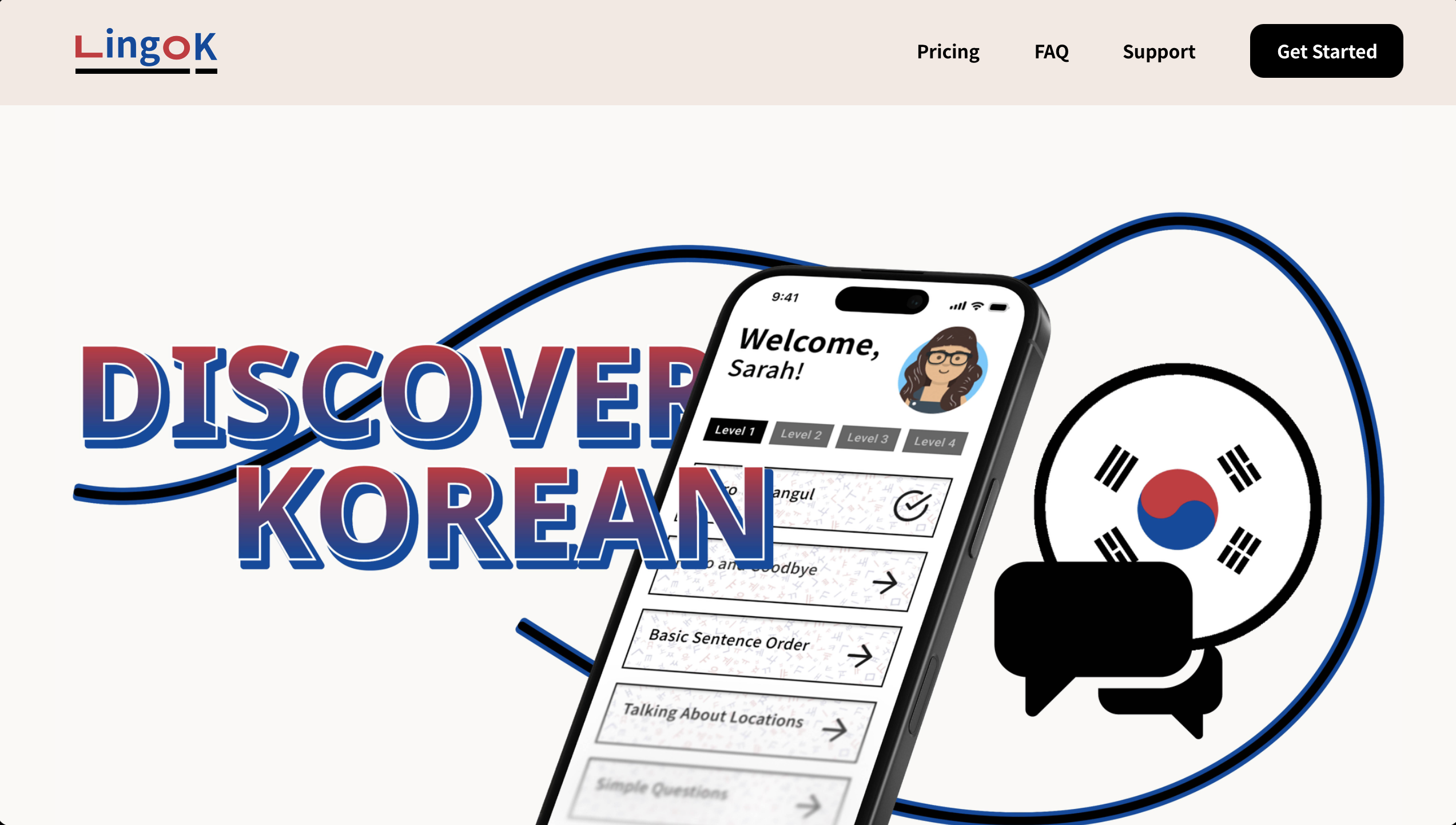 LingoK is a landing page concept promoting a mobile app that helps users learn Korean through daily vocabulary, bite-sized grammar lessons, and real-world language examples. The project focuses on clear visual hierarchy, approachable branding, and a user-friendly experience.