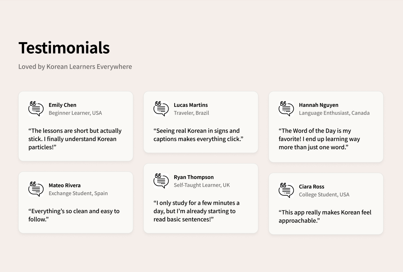 Testimonials are crucial for any app providing a service, and here I included 6, with subheadings describing each user and where they are learning from.